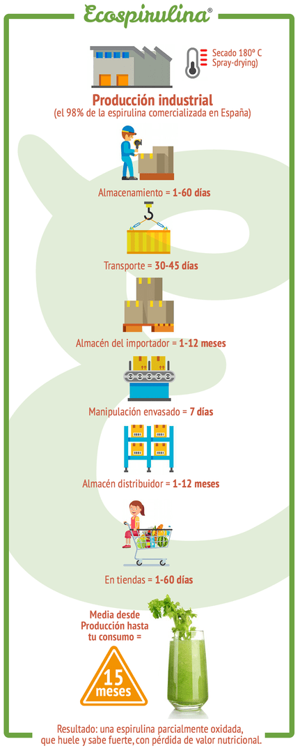 Aquí el tiempo medio de tránsito de la espirulina industrial, el 98% de la que se encuentra en las tiendas y supermercados en España: