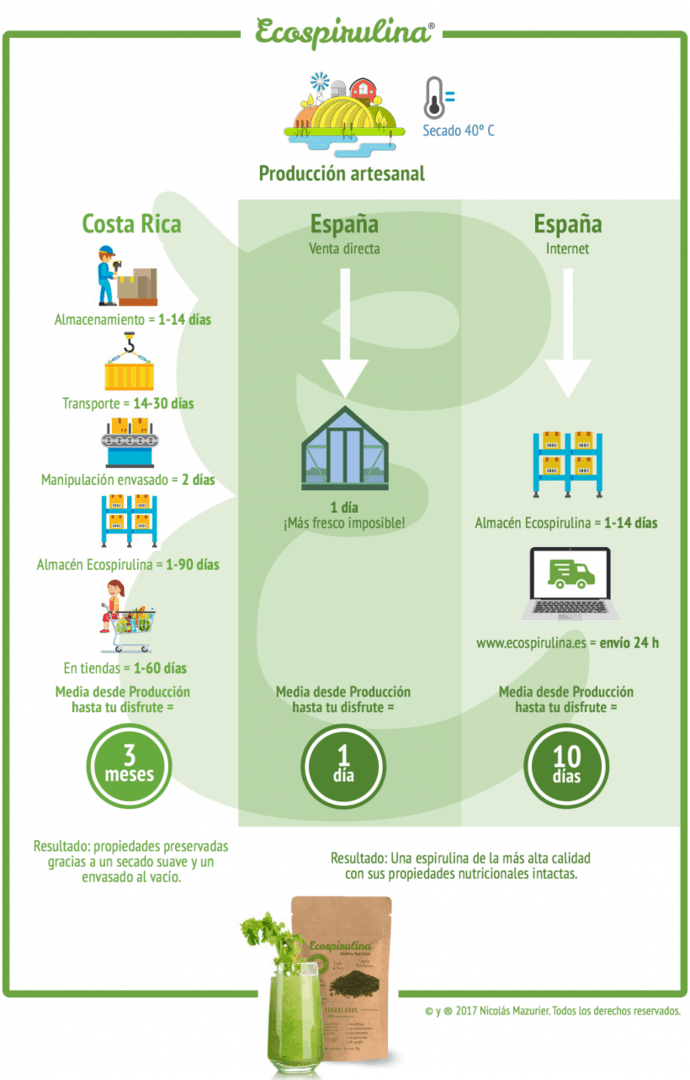 Aquí 2 esquemas: el primero con los productos Ecospirulina (deshidratación a baja temperatura para preservar los nutrientes esenciales). Producción artesanal de Costa Rica vendida en las tiendas (herbolarios) y producción española vendida en nuestra granja de producción y en internet. El plazo medio de entrega es de 3 meses a 1 día si tiene la posibilidad de visitarnos en un día de cosecha para llevarse nuestro «oro verde».